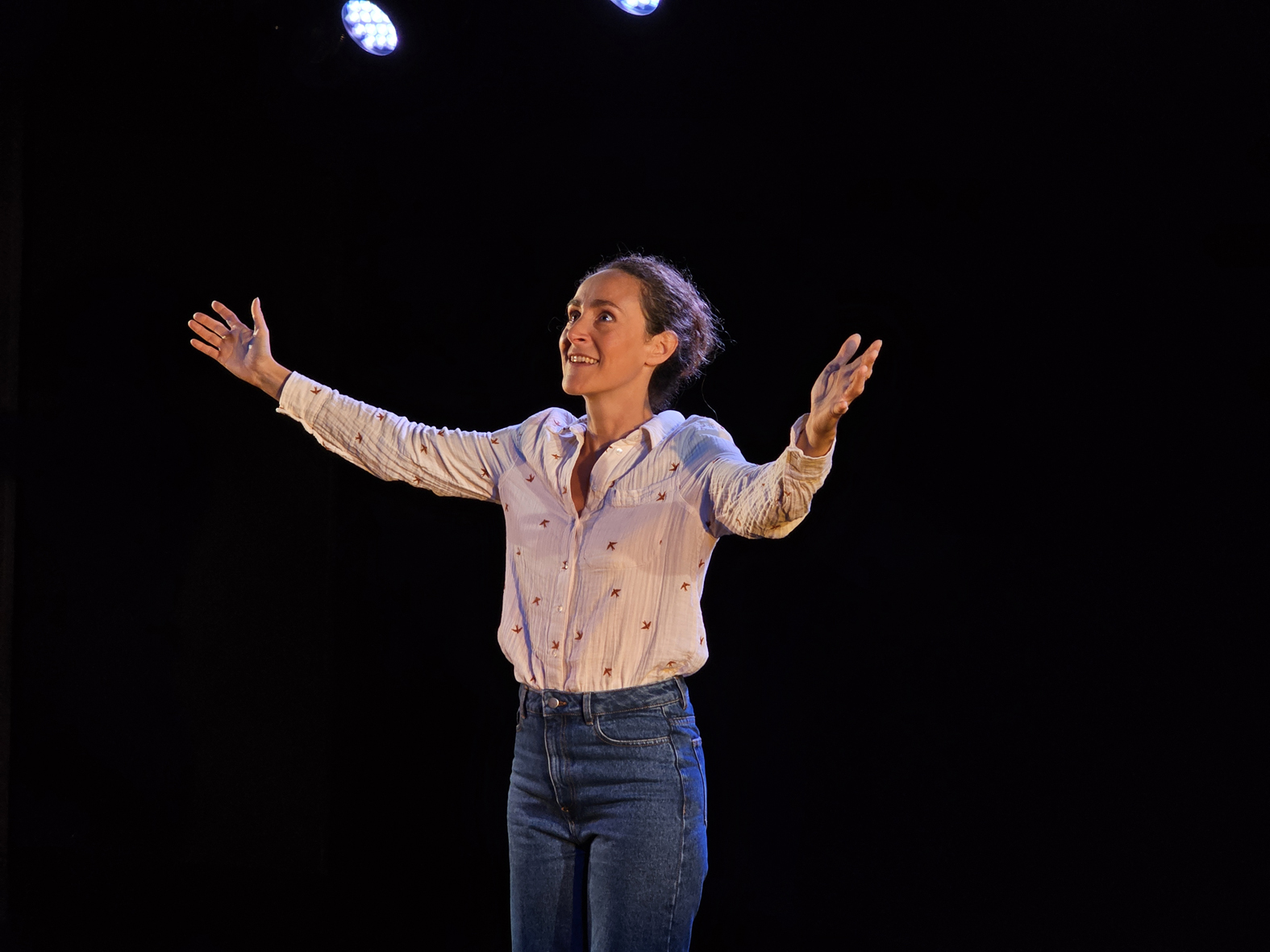 Julie Timmerman enfile avec une simplicité désarmante le costume de ce père mais également de la dizaine de personnages qui gravitent autour de ce projet : la prof de chant, le prof d’art plastique, la directrice, la mère… Elle ne cherche à aucun moment une exagération dans la représentation de ces différents caractères, et passe de l’un à l’autre et d’un lieu à un autre en une fraction de seconde, sans l’aide d’aucun artifice. Ni décor, ni accessoire, mis à part une chaise.