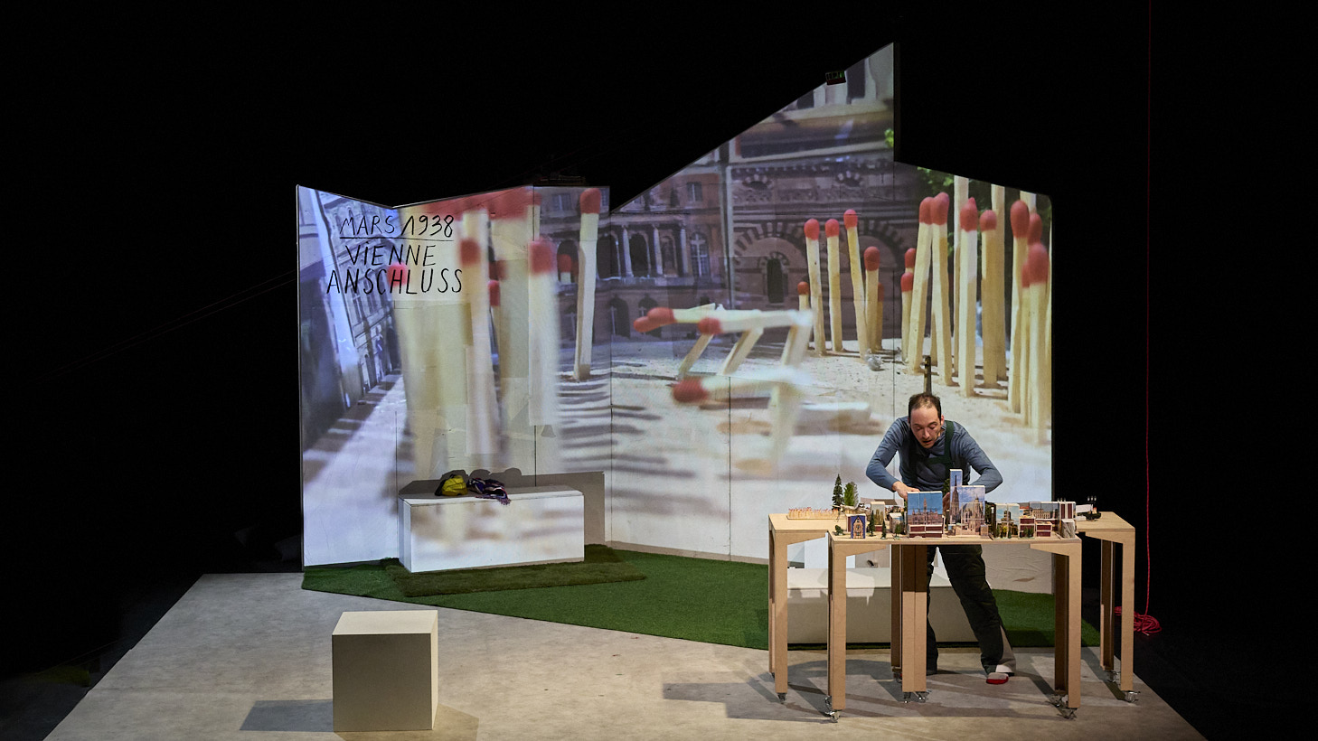 C’est en utilisant des milliers d’allumettes, des ficelles, un téléphérique miniature, du papier, quelques cahiers et l’objectif d’un smartphone que les créateurs de ce spectacle ont mis en place ce théâtre d’objets. Sans oublier des boîtes d’allumettes qui servent de support à des photos représentant la ville de Vienne. Des objets communs, banals, qui deviennent, entre les mains d’Arno Wögerbauer, le décor vivant de l’histoire d’un demi-siècle, depuis la Première Guerre mondiale jusqu’à nos jours.