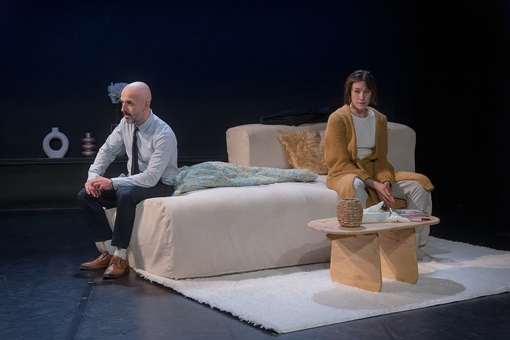 Mais y a-t-il jamais eu quiétude dans ce couple qui va, le temps du spectacle, le temps d’une soirée, faire ressortir les vieilles rancunes, les non-dits, les responsabilités faillies ? Tout se déroule dans un leur salon aux allures bourgeoises, entre le bar dissimulé derrière un rideau à lamelles et la porte de la chambre de leur fille qui sera une présence invisible mais d’une importance primordiale pour le déroulement de l’histoire et les révélations que cette soirée va déclencher. Car c’est bien la naissance de cet enfant qui sera, au fur et à mesure des échanges, la cause, aux yeux de parents, de la déliquescence de leur relation.