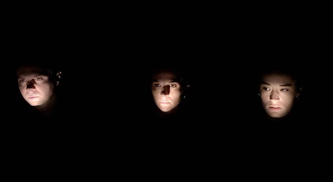 L'originalité du spectacle, c'est qu'il commence par une interruption des lumières. Le noir tombe... et se prolonge. Une lampe électrique s'allume alors et une voix monte. Puis une deuxième et une troisième avec à chaque fois un visage éclairé par un mince faisceau.