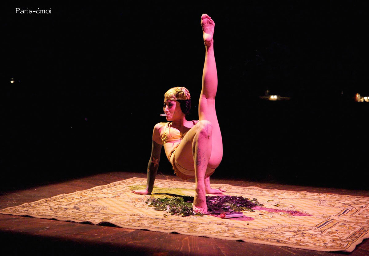 C’est la sensualité, l’esprit libertaire et la volupté qui mènent ici la danse et chacun des numéros qui se succèdent possède peu ou prou ces vertus. Lalla morte, la femme fakir se roule sur des tessons de bouteilles en fumant négligemment une cigarette avant de revenir peindre son corps en fluo dans les halos de lumière noire. La contorsionniste Séverinne Bellini, d’abord en fuseau guépard et cravache… puis s’ingéniant à un lent et souple striptease. Et Tarzana Fourès au trapèze et à la corde lisse, étourdissant les têtes jusqu’à frôler la toile tout là-haut. Et Antoine Delon, à l’équilibre et au jonglage de feu. Alba Faivre agile et flexible comme un serpent s’enroulant sur le mat chinois. Yannick Garbolino plus souvent tête en bas, jambes en l’air que le contraire… Chaque numéro est annoncé de manière on ne peut plus classique par un monsieur Loyal : Kiki Picasso, le visage passé au blanc.