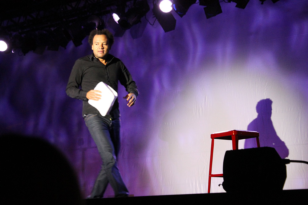 Attention mesdames et messieurs, un snipeur est sur scène et, si vous ne souhaitez pas être dans sa ligne de mire, évitez les premiers rangs ! Pendant près de deux heures, Fabrice Eboué va dégainer et, sans faillir ou faiblir une seconde, il va « cogner » et faire mouche à tous les coups.