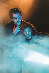 La mise en scène de Pierre Notte, épurée, libérée de tout superflu, de tout artifice et d’une grande précision, laisse toute sa puissance au texte, à la parole implacable et libératrice. Sur la scène, un ordinateur sur une table, quelques verres d’eau en fond de plateau posés sur des chaises noires. L’homme est seul, seul face à ses angoisses et ses interrogations. Pour accentuer cette solitude, Pierre Notte a choisi de lui faire non seulement interpréter les trois personnages mais grâce à un appareil dont il actionne les boutons du pied, gérer son et lumières.