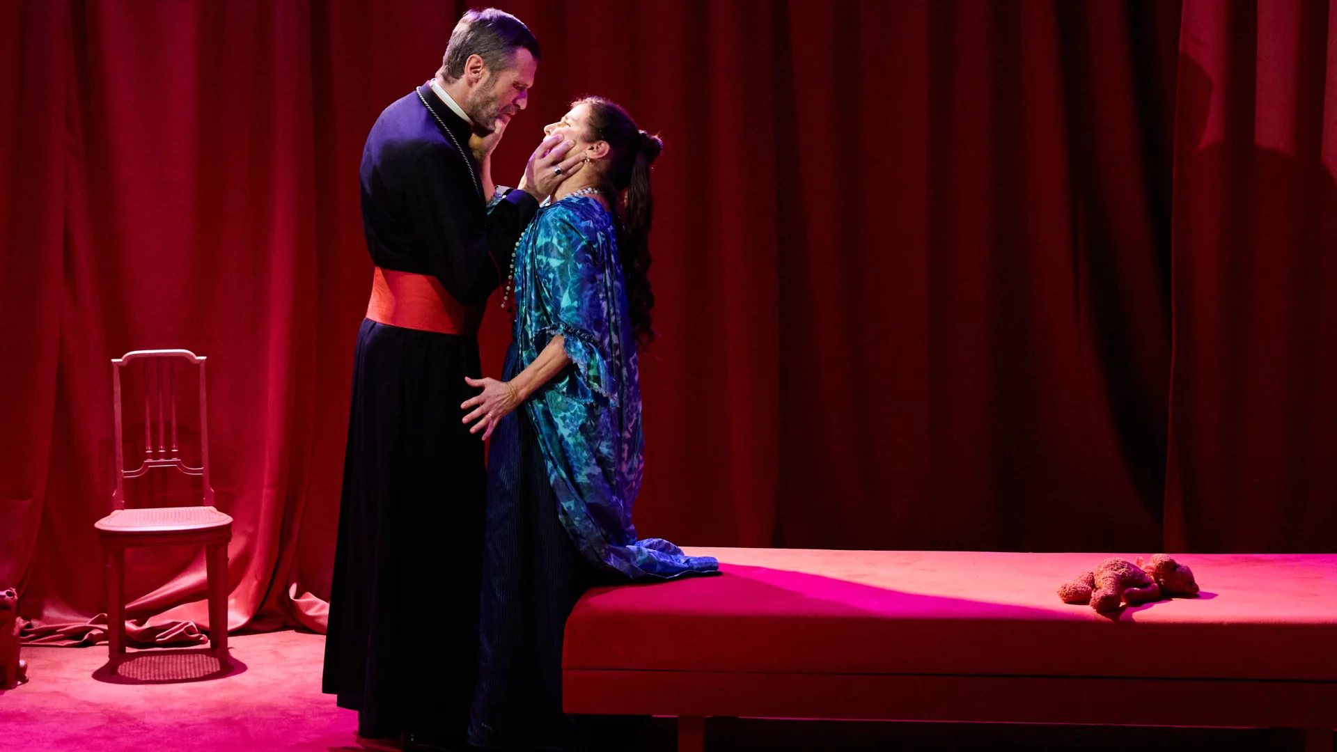 Et là nous assistons ravis et enchantés à une malicieuse et croustillante joute verbale à fleurets mouchetés ! Mais pas que… Dans un décor, suave cocon moelleux où tout est rouge et volupté, le sofa de la belle, les jouets des enfants, le pourpre de la sensualité, le carmin des désirs, on sent que rode le péché pas loin de l’écarlate ! Nous y voilà : le cardinal vient et veut confesser en direct Célimène pour sauver son âme. Tout d’abord, il découvre, choqué, un recueil de dessins de Célimène nue ; Que nenni ! – réalisés par son mari –… Puis elle parle avec tendresse de ses enfants chéris, dont un des garçons adorés ressemble, trait pour trait, au meilleur ami de la famille ; à l’interrogation sidérée d’Alceste qui s’inquiète de la réaction du mari, la maman sereine et amusée rétorque qu’il s’en réjouit tant cet habitué est beau et intelligent… Mais le badinage a ses limites et il faut passer aux choses sérieuses ! Le cardinal avec coercition oblige sa dulcinée à se mettre à genoux pour avouer ses péchés, en jurant sur un missel, la tête au niveau de la soutane « en regardant pas n’importe où, pas n’importe où » comme dit Ferré dans sa chanson… Elle se relève et ses lèvres, au niveau de son cou, murmurent d’émouvants aveux d’un amour couvant sous la cendre :