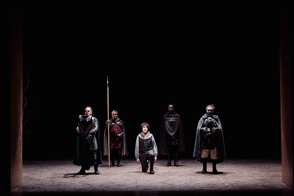 Au plateau, la transition d’une partie l’autre se manifeste par l’ouverture progressive des panneaux qui figuraient d’abord les murailles, laissant voir la noirceur du fond de scène où va se déchaîner la violence, la fureur et la folie des hommes qui veulent rivaliser de pouvoir et de grandeur. Aussi la première partie de la représentation est-elle aussi sobre que la comtesse de Salisbury (Fanny Kervarec, convaincante) est chaste tandis que dans la seconde, qui rappelle à certains moments Henry V, Cédric Gourmelon s’autorise davantage d’effets de surprises. Sous une lumière glacée, au bruit des trompettes qui sonnent comme des sirènes de bateaux, les costumes aux couleurs chatoyantes de la monarchie française contrastent avec les armures clinquantes des soldats qui s’affrontent, jusqu’au triomphe du prince noir (Zakary Bairi, tout en gravité), le fils d’Édouard (Vincent Guédon, tour à tour fébrile et dur, imprévisible et inquiétant). Quelques détours contemporains aussi avec le début frontal, un extrait du groupe de musique Odezenne ou le tableau saisissant des imperméables contemporains dont sont vêtus les pauvres affamés de la ville de Calais qui subit le siège anglais.