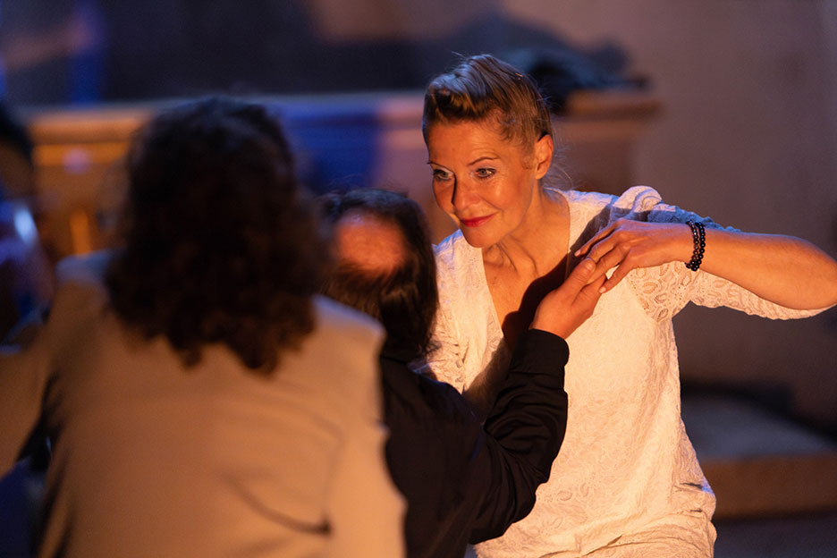 La mise en scène d’Emmanuel Ray partage les mots de Christian Bobin entre Saint François, incarné par Fabien Moiny, d’une vérité impressionnante, et deux comédiennes, Mélanie Pichot et Stéphanie Lanier, qui seront les deux narratrices. Elles sont également des passeuses d’histoire et de grâce, vêtues d’habits contemporains, joueuses et dansantes durant certains moments chorégraphiés. Les accompagne une violoncelliste, Léa Bertogliati, dont les notes profitent de l’acoustique de l’église pour élargir l’espace sonore et multiplier les sons.