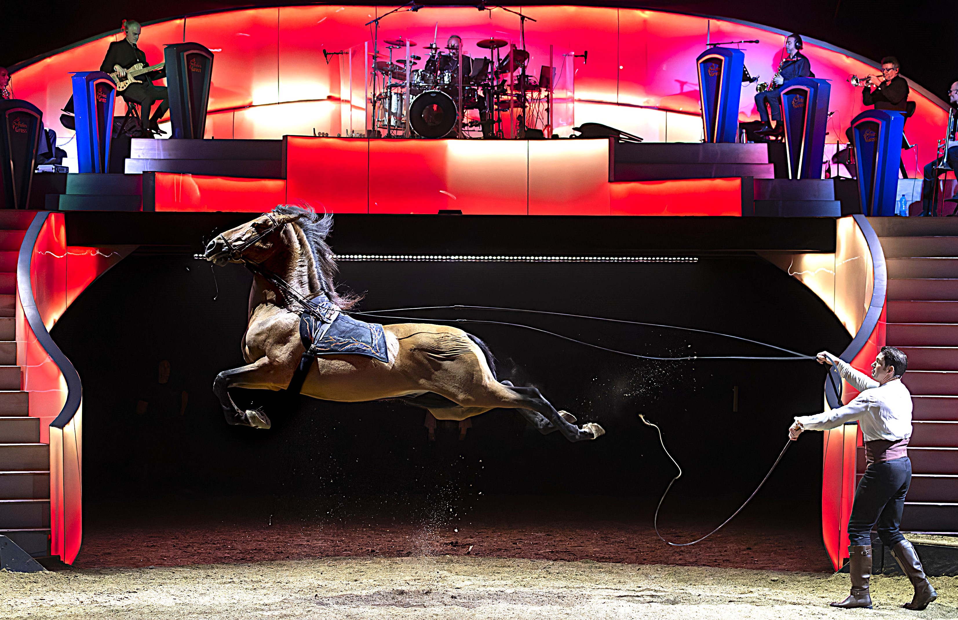 Cette cinquante-deuxième édition du spectacle de la dynastie Gruss est résolument musicale et familiale, et c’est aussi un émouvant hommage au pater familias Alexis Gruss qui a quitté l’arène terrestre l’année dernière… Ses enfants Firmin, Stephan, Maude et leur mère Gipsy, ses petits-enfants et ses arrière-petits-enfants portent son souvenir en reprenant le flambeau avec amour et panache. Ils sont tous passionnés par leur art équestre et saltimbanque, ils y consacrent leur vie, s’adonnent corps et âme et sont totalement dévoués à leurs cinquante fougueux chevaux (onze races de superbes équidés, tous entiers qui plus est !).